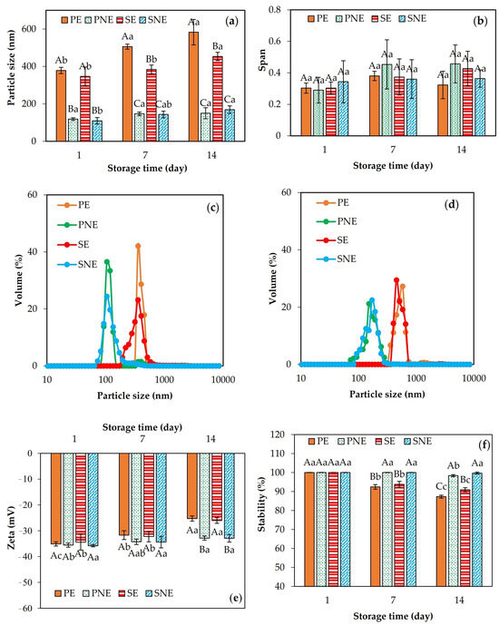 Changes in the particle size (a), span (b), size distribution ((c) (day 1) and (d) (day 14)), zeta potential (e), and stability (f) of peppermint-loaded emulsion (PE), savory-loaded emulsion (SE), peppermint-loaded nanoemulsion (PNE), and savory-loaded nanoemulsion (SNE) as a function of storage time. At the same time of storage, different capital letters indicate significant (p < 0.05) differences between different emulsions. For the same type of emulsion, different lowercase letters indicate significant (p < 0.05) differences over time.
