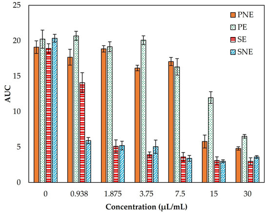 The area under the growth curves (AUC) of Enterococcus faecium as affected by different sample concentrations (0–30 µL/mL) are shown in Figure 2. The antibacterial properties of all samples progressively increased with increasing concentrations of peppermint and savory EOs. The obtained results supported that savory EO presented a more inhibitory effect on the growth of Enterococcus faecium than peppermint, as discussed previously. Moreover, the antibacterial potential of nanoemulsions was significantly stronger than that of emulsions, which could be related to the better physical stability of encapsulated EOs and more homogenous dispersion of EOs droplets in the aqueous phase at the nanoscale [44].