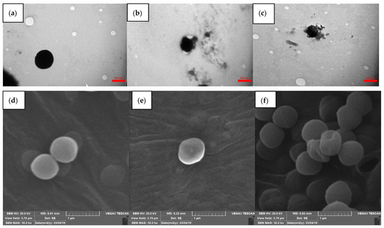 Transmission electron micrograph (a–c) and scanning electron micrograph (d–f) of untreated Enterococcus faecium (a,d), treated with savory emulsion (b,e), and treated with savory nanoemulsion (c,f).
