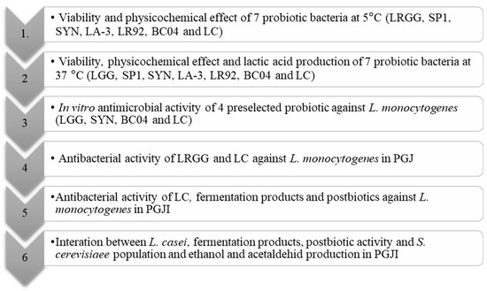 The experimental design is carefully explained in Figure 1. The probiotic strains L. rhamnosus GG (LRGG) and L. casei (LC) were grown in de Man, Rogosa and Sharpe (MRS, Biokar Diagnostics, Beauvais, France) broth for 20–24 h at 37 ± 1 °C. The other five probiotic microorganisms, which were provided freeze-dried, were added directly in the PGJ to obtain an initial concentration of 107 CFU/mL of juice.