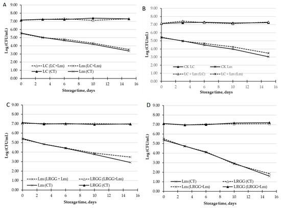 Antimicrobial effect of LC (L. casei) and LRGG (L. rhamnosus GG) against L. monocytogenes (Lm) in PGJ. (A) Population (log CFU/mL) of LC and Lm in peach and grape juice without inulin. (B) Population (log CFU/mL) of LC and Lm in peach and grape juice with inulin. (C) Population (log CFU/mL) of LRGG and Lm in peach and grape juice without inulin. (D) Population (log CFU/mL) of LRGG and Lm in peach and grape juice with inulin.