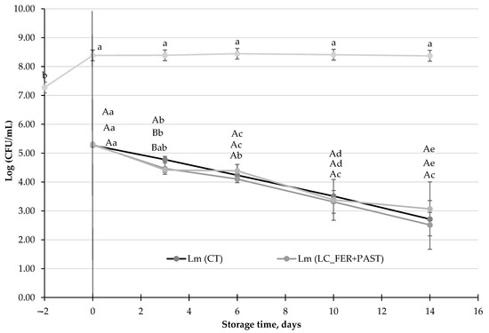L. monocytogenes (Lm) population (CFU/mL) in a L. casei-fermented Lm (LC_FER), L. casei-fermented and pasteurized Lm (LC_FER+PAST) peach and grape juice with 2% inulin (PGJI), and in a PGJI without the probiotic, Lm (CT). LC (LC_FER) shows the population of LC (log CFU/mL) in fermented and non-pasteurized PGJI throughout 21 days of storage at 5 °C. For each day of storage, different capital letters indicate significant differences among distinct treatments. For each juice, different lowercase letters indicate significant differences between the different days of storage according to an ANOVA test (p < 0.05).