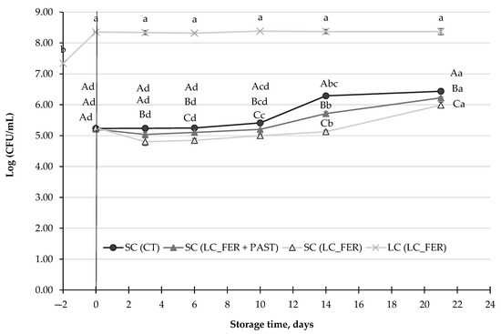 In agreement with Min et al. [43], the storage time significantly affected the survivability of L. acidophilus. Indeed, among the seven studied microorganisms, LA3 was the most sensitive to the juice conditions, as the population decreased faster, and practically no viable cells were found after 21 days of storage. Although Min et al. [43] found less inhibition in the survival of this microorganism, the fruit matrix might be one of the factors that interfered the most with the survival of this microorganism.