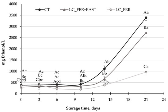 The contents of ethanol and acetaldehyde were determined according to the protocol described by Echeverria et al. [42] At each sampling date, triplicate juice samples (5 mL) were stored at −20 °C until their analysis. Samples were incubated in a water bath at 60 °C and after 60 min, 1 mL samples of the headspace gas were taken with a syringe and injected into an Agilent Technologies 6890 N gas chromatograph (GC) for the determination of both the acetaldehyde and ethanol concentrations. The gas chromatograph was equipped with a flame ionization detector (FID) and a column (2 m × 2 mm i.d.) containing 5% Carbowax on 60/80 Carbopack (Supelco, Bellefonte, PA, USA). The temperature of the injector, detector and oven were 180, 220 and 80 °C, respectively. Concentrations of ethanol and acetaldehyde in the PGJI were calculated using ethanol and acetaldehyde calibration curves prepared by measuring the headspace of Milli-Q water spiked with a known amount of ethanol and acetaldehyde at increasing concentrations and are expressed as mg/L.
