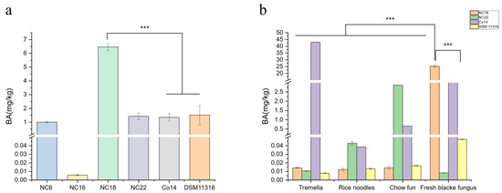 Bongkrekic acid production in soaked black fungus and foods. (a) The measurement of four isolated and two standard strains for the production of bongkrekic acid in black fungus soaked for 72 h. (b) The measurement of NC18, NC22, Co14, and DSM 11318 for the production of bongkrekic acid in tremella, rice noodles, chow fun, and fresh black fungus foods. *** indicates diferences exist between strains and foods when p < 0.001.