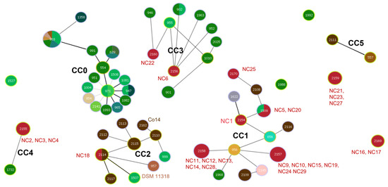A visual geoBURST analysis was constructed between the STs of isolates and other strains from diverse sources at the level of TLV. In Figure 3, the distribution of STs in different clone complexes (CCs) reflects the correlation between genetic distance and evolutionary relationship between close relatives of STs [28]. At the threshold of TLV, isolates and standard strain STs were divided into three main CCs, two secondary CCs, and several singletons. Among the three main CCs, the isolated strains were related to other strains including environment and a CF patient source. Therefore, it can be considered that the source of these wild-type isolates may be the environment or human beings; a wild range of routes B. gladioli pv. cocovenenans may take to contaminate black fungus is inferred. Notably, CC2 contained NC18, standard strains Co14, and DSM11318; thus, this CC needs special care due to high toxicity. The gathering of these strains denotes the effectiveness of MLST for recognition of highly risky strains. The strains from the environment and CF patient all have been reported to be bongkrekic acid positive [29].
