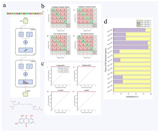BP neural network prediction of toxigenic phenotype. (a) The BP neural network model with the two-layer structure of 2811−15−4; (b) the classification accuracy of the training set (I), validation set (II), test set (III) and overall data set (IV) of this model; (c) the ROC curve of the model on training set (I), validation set (II), test set (III) and overall data (IV), respectively; (d) external data validation results, (+) is toxin positive and (−) is toxin negative, the length of the color block serves as an indicator of the probabilistic assessment for each classification.