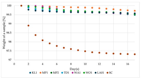 The fermentation was conducted over 17 days (Figure 1). Based on weight loss, it is clear that S. cerevisiae US-05 (SC) carried out the fermentation at the fastest pace. It also fermented the highest amount of sugars from the wort among all the evaluated species. Based on the course of the fermentation, the primary fermentation of SC took place between days 1 and 8. The other yeast species conducted the fermentation more slowly and to a much lower degree (Figure 1).