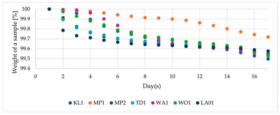 More pronounced differences between the yeast species can be seen in Figure 2. The low-alcohol brewing strain of S. cerevisiae (LA01) performed the fermentation at the fastest pace. A similarly fast fermentation course for this strain was reported by González-Siso and Becerra [15]. On days 12–14, the weight losses of beers with different yeasts were at a similar level, except for the MP1 strain. Overall, the MP1 had the slowest fermentation rate. After days 12–14, the fermentation was still continuing slowly for all the evaluated yeast species. However, it was arrested as the fermentation times became unreasonably long. Under industrial conditions, fermentation times for beer can be as short as 3 days for ales and 14 days for lagers. However, these times are highly variable [25,26]. The slow fermentation rate was likely due to lack of maltose utilization [18]. Jackowski et al. [27] reported of T. delbrueckii strain with a similar fermentation rate to S. cerevisiae, when the wort with reduced maltose content was used. Based on Figure 2, the primary fermentation for the non-Saccharomyces yeasts and LA1 lasted from day 1 to days 8–10 of the experiment.