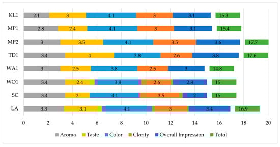 The overall evaluation of the beers is consistent with previous results. The SC sample was rated the worst among all the samples. This was mostly unexpected, as this strain (SafAle US-05) is widely used in beer production. The panelists noted that the obtained beer was empty in flavor and sour. The commercial strain for low-alcohol beer—LA—received very positive notes. However, the best impression was made by the two non-Saccharomyces yeasts, TD1 and MP2. The same trend was observed in the total score for each beer. It must be noted, however, that T. delbrueckii ‘lost’ a significant part of its total score due to the low clarity of the produced beer (Figure 3 and Figure 4). This parameter might be optimized in the production environment. T. delbrueckii yeasts have long been seen as promising candidates for obtaining uniquely flavored beers and wines [69,70]. The other yeast species which was found interesting—M. pulcherrima—has been much less frequently examined with regard to its sensory properties.