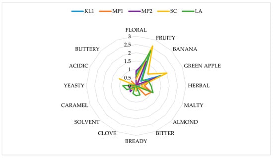 The SC sample was characterized by the strongest aroma of green apple. This scent is usually seen as a defect. It was probably caused by the high levels of the acetaldehyde, which is described as having a crisp green apple flavor or a grassy one. This compound is an intermediate in the formation of ethanol and acetate, with a sensory threshold of 10–20 mg/L [71]. A probable explanation for such high levels of this compound in US-05 fermented beer is the fact that this beer has the highest ethanol level among all the samples (Table 1). Since acetaldehyde is a precursor for ethanol, its high levels are to be expected. This aroma was also noticeable, albeit to a lower degree, in KL1 and MP2 beers.