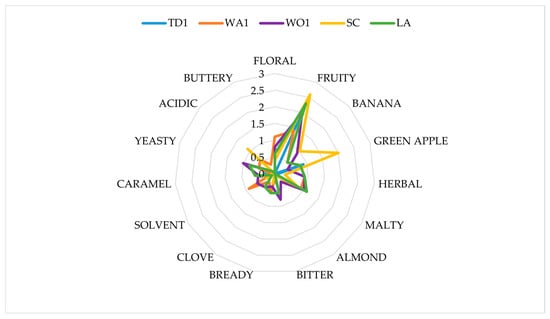 All of the beers were characterized by mostly fruity aromas; however, the highest intensity of this aroma was found in both S. cerevisiae fermented beers, SC and LA. The second highest intensity was found for KL1, WO1, and TD1. The fruitiness of beers brewed with T. delbrueckii has been documented in the literature [74]. W. anomalus is known to impart fruity notes in wine fermentation, and K. lactis has been proposed as one of the yeast species that can produce such aromas [11,75].