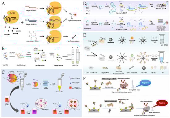 Rolling circle amplification (RCA) is one of the classical methods for single-stranded amplification, which can produce many consecutively repeated ssDNA products in a short time. This feature can be perfectly matched with CRISPR/Cas12 and CRISPR/Cas14a (Figure 2D). Ke et al. developed the RETA-CRISPR system for the accurate detection of circRNAs using RT-RCA and CRISPR/Cas12a [58]. Yang et al. developed a Cas14R system for high-specificity analysis of microRNA using RCA and CRISPR/Cas14 [59]. With the target as a primer, RCA amplification of the circle template containing the PAM sequence produces ssDNA products containing a lot of repeated target sequences, which bind to the crRNA and activate the trans-cleavage activity of Cas12 or Cas14a. For non-single-stranded nucleic acid targets, RCA amplification is also possible after single-stranded transformation. Xu et al. established a rapid detection method for bacteria based on RCA and CRISPR/Cas12a by using aptamer for target transduction [60]. Aptamers A and B of protein A on the surface of bacteria and PBPa2 protein are selected, in which aptamer A is coupled to magnetic beads and aptamer B is blocked by complementary chains. When target bacteria are mixed with the two aptamers, “aptamer A-bacteria—aptamer B” are separated through magnetic separation, and the remaining complementary chains are used for RCA. Then, the trans-cleavage activity of Cas12a is activated by the RCA products. Wang et al. combined RCA and CRISPR/Cas9 to establish the RACE (RCA-assisted CRISPR/Cas9 cleavage) detection platform [61]. After RCA, additional complementary probes are then added to assemble dsDNA products, which are recognized and paired with crRNA to activate Cas9 cleavage activity.