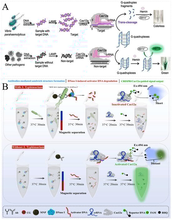 Principal diagram of foodborne pathogen detection by CRISPR/Cas-based nucleic acid biosensors. (A) Schematic illustration of the label-free colorimetric biosensor for the detection of Vibrio parahaemolyticus. In the presence of Vibrio parahaemolyticus, LAMP products combine with crRNA. The active Cas12a cleaves the G4 probe and is unable to catalyze a color change in ABTS2−. The positive and negative results can then be easily distinguished by the obvious color differences. Reprinted with permission from [87]. Copyright 2021 American Chemical Society. (B) Schematic illustration of the CATCHER for the detection of Salmonella Typhimurium. Once the “MNP-Ab/S. Typhimurium/CG-Ab-DNase I” is formed, DNase I converts activator DNA to invalid DNA fragments, resulting in the inactivation of Cas12a and the silencing of the signal output system. Reprinted with permission from [90]. Copyright 2022 Elsevier B.V.