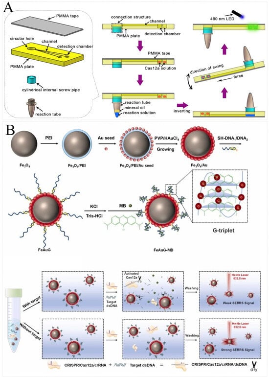 To improve portability, Wu et al. developed a CRISPR/Cas12a-based portable biosensor (Cas12a-PB) to detect GM soybeans. Emphasis was placed on the preparation of polymethylmethacrylate (PMMA) with a connection structure, three channels, and three detection chambers. LAMP assay reagents and CRISPR/Cas12a assay reagents were preloaded onto PCR tubes and detection chambers, respectively. This novel portable dual detection platform successfully realized the simultaneous detection of the CaMV35S promoter and lectin gene, with a detection limit of 0.1% (Figure 4A) [95]. CRISPR/Cas12a was coupled with SERS to form a variety of novel platforms for the detection of GMOs. Su et al. combined CRISPR and SERS with a magnetic SERRS nanoprobe (FeAuG-MB) to convert the detection of GMOs’ DNA into a SERS signal and applied it to the ultrasensitive detection of 35S and Nos genes, showing excellent specificity and sensitivity (Figure 4B) [92].