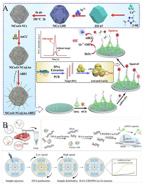 Principal diagram of food adulteration detection by CRISPR/Cas-based nucleic acid biosensors. (A) Schematic illustration of the ECL biosensor for the detection of pufferfish. This involved NiCo2O4 NCs@Au-ABEI designed as nanoemitters that were immobilized on the electrode surface by nucleic acid hybridization. The trans-cleavage activity of CRISPR/Cas12a was initiated when pufferfish DNA was present, leading to a nonspecifically cleaved ssDNA and releasing NiCo2O4 NCs@Au-ABEI. As a result, the ECL signal was significantly increased. Reprinted with permission from [98]. Copyright 2024 Elsevier Ltd. (B) Schematic illustration of CIPAM for the simultaneous detection of pig, chicken, duck, and lamb. The modules of the centrifugal microfluidic chip were pre-loaded with the reagents required for the RAA-CRISPR/Cas12a reaction for integrated operation. If target DNA was present, a fluorescent signal appeared in the corresponding reaction module. Reprinted with permission from [100]. Copyright 2024 Elsevier Ltd.
