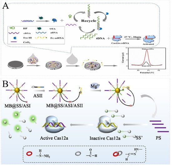 Principal diagram of biotoxin detection by CRISPR/Cas-based nucleic acid biosensors. (A) Schematic illustration of the neoteric electrochemical biosensor for the detection of OTA. Using an Exo III-assisted recirculation reaction, the target recognition transaction was converted into a triggering DNA strand and amplified into the trans-cleavage activity of Cas12a to detect changes in electrochemical signals. Reprinted with permission from [103]. Copyright 2023 Elsevier B.V. (B) Schematic illustration of the hydrazone ligation-assisted DNAzyme walking nanomachine for the detection of lipopolysaccharide. In the presence of LPS, LPS bound to the aptamer in the complex to release ASII, triggering subsequent reactions and enhancing fluorescence. Reprinted with permission from [104]. Copyright 2021 Elsevier B.V.
