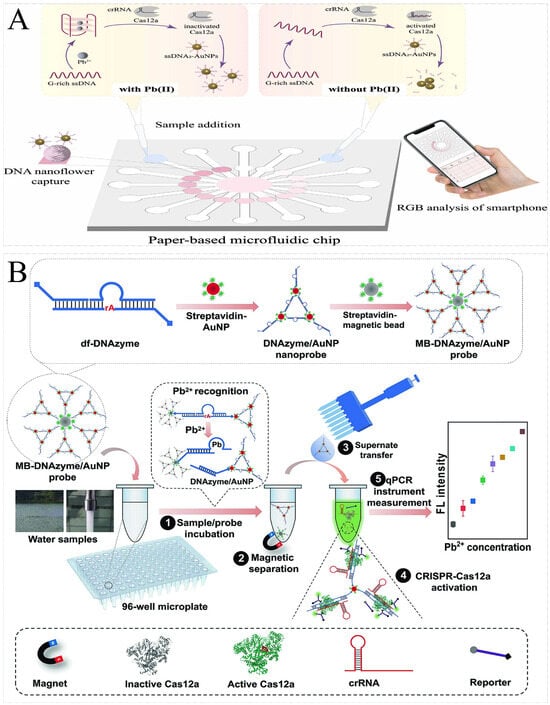In addition to metal-induced cleavage activity, Pb2+ can induce the folding of G-rich sequences into G-quadruplex structures with higher stability. Yu et al. first found that the Pb2+-induced G-quadruplex could resist trans-cleavage by CRISPR-Cas12a. Then, a fluorescence biosensor was constructed to detect Pb2+, with a minimum detection limit of 2.6 nM. The biosensor had the advantages of high stability, high sensitivity, and low cost [109]. Based on this, Zhang et al. constructed a paper-based microfluidic biosensor for the portable detection of Pb2+. The detection of Pb2+ could be achieved by analyzing R/G values using SmartIons APP, with the lowest detection limit of 18.3 nM. The paper-based microfluidic biosensors showed great potential for the on-site detection of Pb2+, given the low cost, ease of customization, and multi-channel nature (Figure 7B) [110].