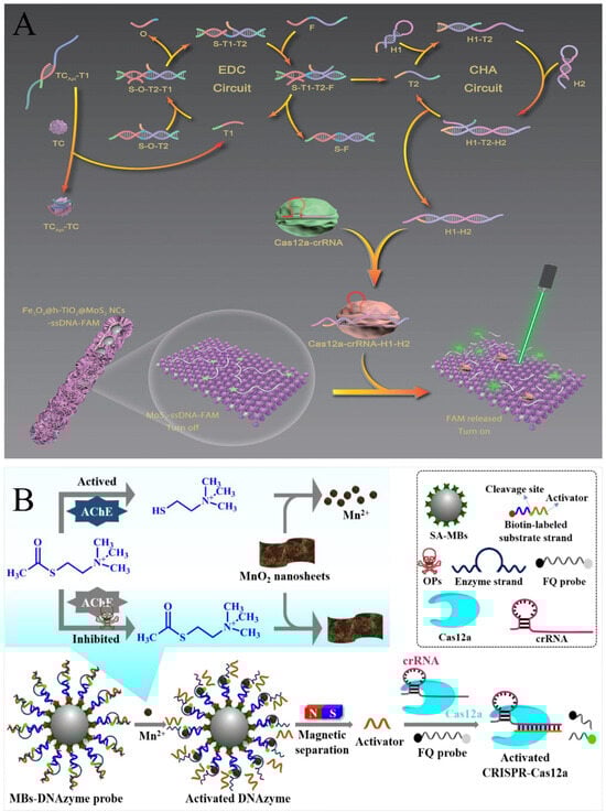 Principal diagram of pesticide and veterinary drug detection by CRISPR/Cas-based nucleic acid biosensors. (A) Schematic illustration of TCApt-EDC-CHA-Cas12a sensing for the detection of tetracycline. In the presence of tetracycline, the release of the complementary strand from the aptamer triggered the cascade amplification circuit, which, in turn, activated the activity of Cas12a to cleave FAM-ssDNA to restore fluorescence. Reprinted with permission from [117]. Copyright 2023 Wiley-VCH GmbH. (B) Schematic illustration of the AChE-mediated fluorescence biosensor for the detection of OPs. In the absence of OPs, TCh containing reducing sulfhydryl groups was generated, which induced the degradation of MnO2 nanosheets and produced Mn2+ to cleavage the Mn2+-dependent DNAzyme. Then, the released short DNA activated the activity of Cas12a to cleavage ssDNA probes, resulting in a change in fluorescence. Reprinted with permission from [114]. Copyright 2022 Elsevier Ltd.