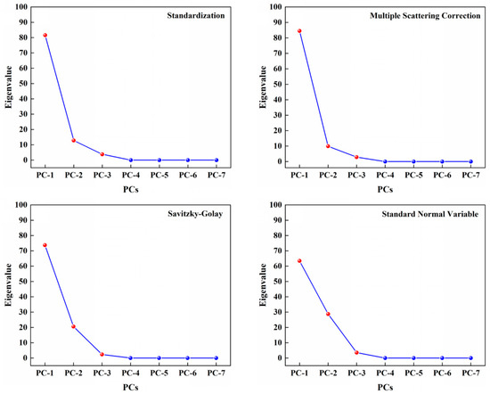 A comparative analysis of the mung bean samples of different origins, preprocessed with near-infrared (NIR) spectra, was conducted using PCA. The NIR spectral data were subjected to preprocessing using the four processing methods. To determine the optimal number of principal components, the principal component variables were screened, and we drew the principal component rubble map (Figure 2), from which the first three principal components can be extracted.