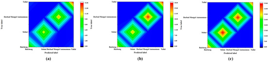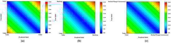 The PCA feature extraction information from the spectral preprocessing of mung bean samples with varying quantities (n = 200, 400, and 600) was used to construct NIR discriminant models of mung bean samples in different quantities. This was achieved by integrating the KNN method. The same 3.1.3 method was used to generate the results shown in Table 6, which presents the classification results for different sample quantities of mung beans. Figure 4 shows the corresponding contour maps. As illustrated in Table 6 and Figure 4, the overall discrimination accuracies of the origin discrimination were 94.00%, 97.00%, and 98.67% for classes A (n = 200), B (n = 400), and C (n = 600), respectively. Among the results of mung bean origin discrimination obtained using 200 samples, three samples were misidentified. One sample from Tailai was misclassified as Sishui, one sample from Baicheng was misclassified as Sishui, and one sample from Sishui was misclassified as Baicheng. The results of the mung bean origin discrimination obtained using 400 samples revealed two misclassified samples: one from Baicheng misclassified as Sishui, and one from Sishui misclassified as Baicheng. Similarly, the results of the mung bean origin discrimination obtained using 600 samples revealed two misclassified samples: one from Baicheng misclassified as Sishui, and one from Sishui misclassified as Baicheng. A comparison of the results of the mung bean origin discrimination with different sample quantities revealed that the correct rate of mung bean origin discrimination with multiple sample quantities (n = 600) was higher than with fewer sample quantities (n = 200).