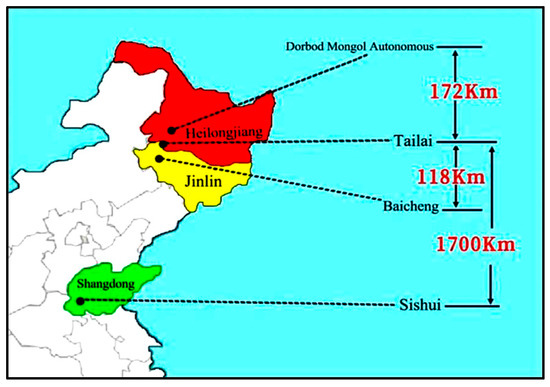 Mung bean samples were collected one week before the 2021 harvest using a representative checkerboard sampling method specifically tailored to diverse origins and agricultural range settings. The sampling locations were established at five strategic points—east, west, south, north, and center—within each region [17]. Test samples were randomly collected from designated points in Tailai County (Tailai) and Dorbod Mongol Autonomous County (Dorbod Mongol Autonomous) in Heilongjiang Province, Baicheng City (Baicheng) in Jilin Province, and Sishui County (Sishui) in Shandong Province. Each region is associated with a distinct geographical indication of mung beans. Approximately 2.0–3.0 kg of pods was collected from each site. A GPS device (NEO-6M-0-001, Shenzhen Pengrunfa Electronics Co., Shenzhen, China) was used to record detailed information, including collection sites, varieties, and geographic coordinates (longitude and latitude) (Table 1).