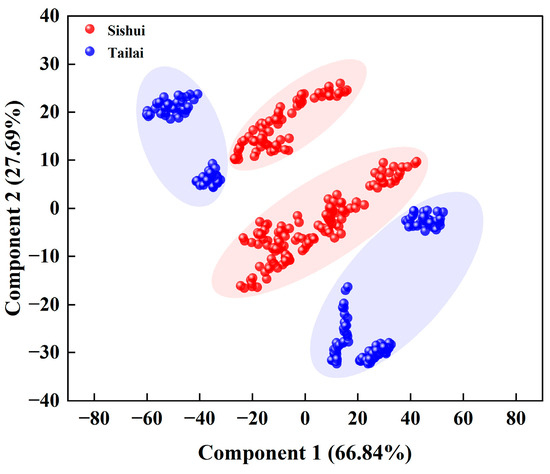 As illustrated in Figure 6, the sum of the contribution rates of the first and second PCs in A (Tailai-Sishui) exceeded 90.00%. The cumulative variance contribution rate of the first principal component was 66.84%, whereas that of the second principal component was 27.69%. This indicates that the larger traceability scale differentiated the two origin mung bean samples effectively, and that the first two extracted PCs could be used in the discriminant analysis of the two origins of Tailai-Sishui.