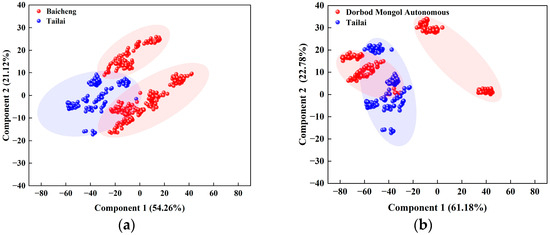 PCA plot of mung bean discrimination at a smaller scale: (a) principal component plot of mung bean at the scale of Tailai-Baicheng; (b) principal component plot of mung bean at the scale of Tailai-Dorbod Mongol Autonomous.