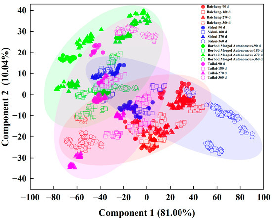 As illustrated in Figure 9, the sum of the contribution rates of the first and second PCs in four origins at different shelf lives (90, 180, 270, and 360 d) exceeded 90.00%, with the first principal component contributing 81.00% of the cumulative variance and the second principal component contributing 10.04% of the cumulative variance. However, by synthesizing, it can be visualized that there is a crossover between the four origins for the different shelf lives. This demonstrated that the disparate shelf lives of the collected samples influenced the outcomes of the origin discrimination.