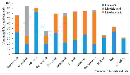 The unsaturated fatty acid contents of edible vegetable oils from different raw materials differ significantly (Figure 1). The saturated, monounsaturated, and polyunsaturated fatty acids ratio in rice bran oil is 0.6:1.1:1, which is close to the golden share ratio advocated by the WHO and is a hallmark of “healthy” edible oils []. The triglycerides in rice bran oil are mainly composed of the following three fatty acids: palmitic acid (C16:1), oleic acid (C18:1), and linoleic acid (C18:2). These fatty acids accounted for more than 90% of the total fatty acids in rice bran oil. Oleic acid is the most abundant FFA in rice bran oil, accounting for 42% of the total triglycerides, followed by linoleic acid (32%); however, myristic and stearic acids are relatively limited []. The fat content of Indian rice bran is as high as 24% and is mainly composed of oleic acid (48.48%), linoleic acid (35.26%), palmitic acid (14.54%), and FFAs (8.15%), with abundant antioxidants, including glutamic acid, tocopherol, and tocopherol [].
