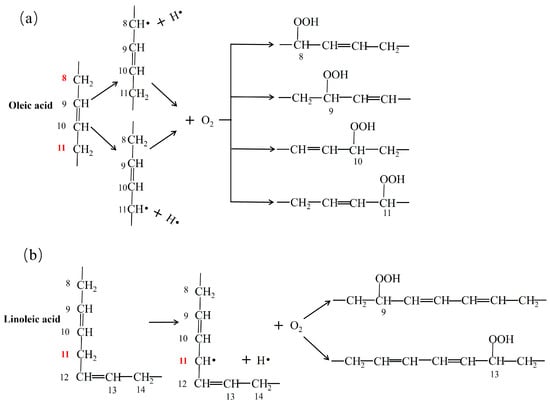 Oxidation mechanism for oil: (a) oleic acid; (b) linoleic acid.