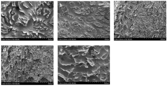 Effect of tenderization process on microstructure of pork skin observed via SEM with selected magnification of 100×. (a) Untreated stage (0 min); (b) 30, (c), 60, (d) 90, and (e) 120 min stages.