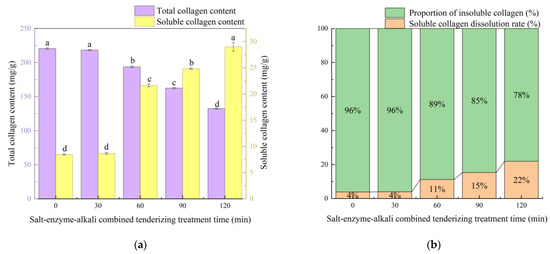 Changes in collagen content and solubility in pig skin during salt–enzyme–alkali combined tender treatment. (a) Changes in the total and soluble collagen content of pig skin during tenderization treatment; (b) changes in the dissolution rate of pig skin collagen during tenderization treatment. Different letters (a–d) indicate significant differences between different samples (p < 0.05).