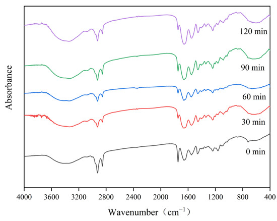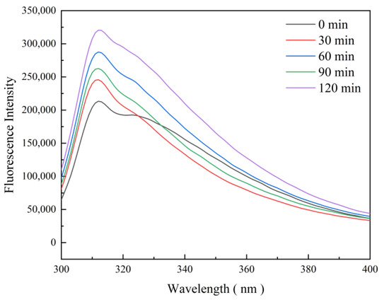 Figure 3 shows the fluorescence spectra of collagen under salt–enzyme–alkali tenderization treatment with different tenderization times. The endogenous fluorescence intensity of pig skin collagen increased significantly with prolonged tenderization. Thus, the tenderization process can cause an energy transition in collagen, which increases the fluorescence intensity of collagen, exposes a large amount of collagen hydrophobic groups, and alters the tertiary structure of collagen. The maximum emission wavelength of the 30 min treatment group changed from 312.0 nm to 311.4 nm compared with that at 0 min. According to Zhao et al. [58], chloride may disrupt the triple-helical structure of collagen, which leads to the unfolding of its polypeptide chains and the exposure of hydrophobic groups. Therefore, CaCl2 favored the unfolding of the molecular structure of pig skin collagen, which exposes the internal tyrosine groups; this condition led to an increase in the intensity of endogenous fluorescence. The maximum emission wavelength of the 60 min treatment group was blue-shifted to 310.8 nm, which suggests that certain portions of the molecular structure of collagen were further exposed, which led to the easier jumping of fluorescent substances between the excited and ground states. Therefore, the emission wavelength shifted in the short-wave direction. The papain treatment degraded the alanine- and hydroxyproline-rich regions of collagen and loosened its structure, which exposed large amounts of tryptophan, causing an increase in the intensity of endogenous fluorescence or the maximum wavelength of emission. In addition, the maximum wavelength of emission in the 90 min treatment group was red-shifted to 313.2 nm. In the alkaline environment of Na2CO3, the collagen was denatured, and its original tightly packed structure was relaxed and unraveled. Some aromatic amino acids were exposed, which increased the polarity of the collagen solution for easier interaction with polar solvents, such as water. The maximum emission wavelength was red-shifted to 314.3 nm at 120 min, which indicates that the salt–enzyme–alkali rejuvenation treatment can change the collagen structure, increase its solubility, and expose more aromatic amino acid residues, and that papain was able to cleave collagen more efficiently during the treatment to produce smaller peptide fragments.