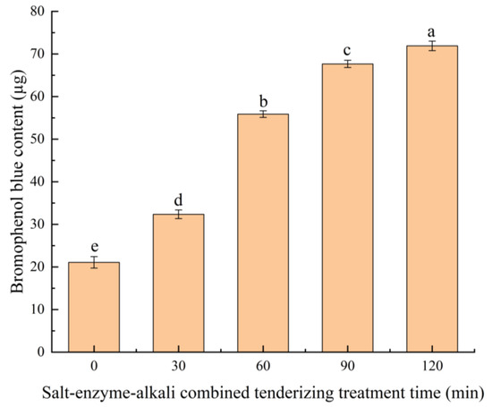 During the salt–enzyme–alkali tenderization of the pork skin, the pork skin shear force decreased significantly (p < 0.05) with the progression of tenderization, as observed in Table 1. The decrease in the shear force of pork skin at a treatment time of 30 min was observed mainly because the Ca2+ in CaCl2 increased the activity of calcium-activated proteases, which rendered the myofibrillar structural proteins unstable. In addition, CaCl2 can promote the dissolution of myosin and actin, which reduces the hardness of pork skin and enhances water retention [34]. Gerelt et al. [35] discovered a considerable improvement in the shear force of pork skin by submerging dehydrated meat in a 150 mM CaCl2 solution, which significantly improved the tenderness of the meat, without adversely influencing other taste and quality characteristics. A significant decrease in the shear force was observed at 60 min (p < 0.05). This result was attributed to the capability of papain to properly degrade collagen, elastin, and myofibrillar proteins in meat, which results in the disruption of their reticular structures and an increase in protein solubility. Lyng et al. [36] conducted experiments using test tubes, which revealed that protease was active on myofibrils and collagen. At 60–120 min, Na2CO3 caused an increase in the ambient pH, which can improve electrostatic repulsion and promote myofibrillar fibrin and collagen dissolution. When the ambient pH was increased, it promoted pork skin tenderization. This result is consistent with that of Petracci et al. [35,37], who reported that their samples had higher cooking yields and more tenderized meat when the pH was increased.