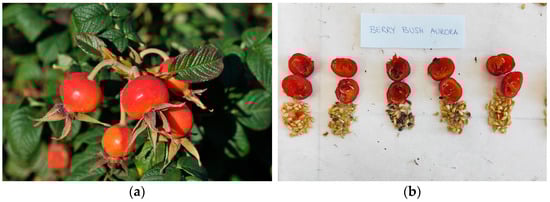 Fruits of the cultivar ‘Berry Bush Aurora’ (BBA) were evaluated for quantitative and qualitative features: (a) rosehips in the field; (b) the assessment of fruit, mesocarp, and seed traits in the laboratory.