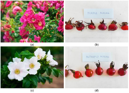 Two cultivars with contrasting fruit mass, dimensions, and flatness level: (a,b) ‘Purple Aurora’ (PAU) plant in the field and harvested rosehips; (c,d) ‘Butterfly Aurora’ (BA) plant in the field and harvested rosehips.