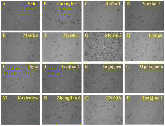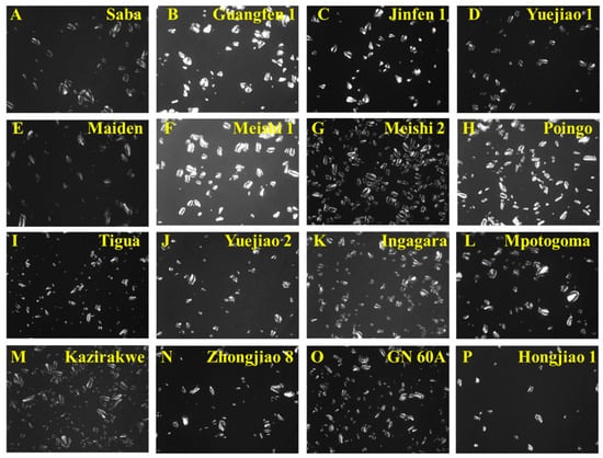 Polarized light microscopy images (×200) of BRS from 16 banana cultivars.