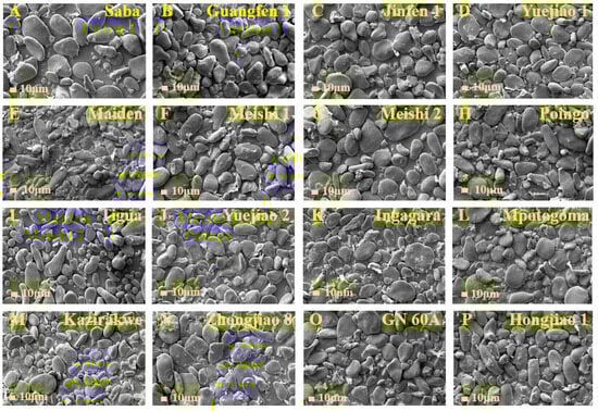 The morphology of 16 BRS sample particles was observed to have ring patterns with different particle shapes, recorded as flat, irregular oval, slender rod, and cone shaped (Figure 2), consistent with the findings from a previous study []. All the particles had birefringence without distinct differences under the polarized light, appearing as Maltese crosses (Figure 3). The Maltese crosses were attributed to the existence of the radial alignment of the crystalline structures in the BRS particles, suggesting that intact crystalline structures were retained during the starch extraction. Through SEM analysis, more details of the starch granules, including size and shape, the presence of other compounds, structural integrity, and surface morphology, were analyzed (Figure 4). The BRS granules of the 16 banana cultivars from the three genome groups displayed a wide range of particle sizes (10 μm–60 μm) and a tight arrangement. Parts of the BRS granules had smooth and unbroken surfaces, while there were also some having cracks and wrinkles on the surface with sheet fragments attached. This phenomenon may be explained by the fact that during the early postharvest ripening, cell walls consisting of pectin, cellulose, and a small amount of protein were left over the surface after starch degradation [].