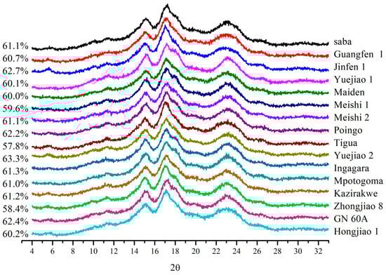 X-ray diffraction patterns and crystalline parameters of the BRS from the 16 banana cultivars covering different genome groups are presented in Figure 5. These patterns were used to study the type and level of BRS crystallinity over the different cultivars. Previous studies have reported that natural banana starch exhibits three types of crystal structures, including type A [], type B [,], and type C []. In our study, all particles were found to exhibit a weak diffraction peak at 5.6 °θ and a broad peak ranging from 22° to 24 °θ, suggesting that they were B- or C-type crystals rather than A-type crystals. Saba (ABB), Jinfen 1 (ABB), Meishi 2 (AAB), Poingo (AAB), and GN 60A (AAA) were identified as C-type crystals with a weak peak at 5.7°, moderate peaks at 15.0°, 19.5°, and 22.0 °θ, and a strong peak at 17.0 °θ. The C-type pattern was a mixture of A-type crystal and B-type crystal. The other 11 BRS samples contained reflections at 2θ values of 5.6°, 15.0°, 17.0°, and 23.0 °θ, which are attributed to the B-type crystal. These results revealed that the different BRS granules had different crystal types. Even samples of BRS with the same genome had different crystals, showing the banana genotypes did not significantly impact the crystalline pattern of the starch. Instead, the growth conditions of the banana cultivars were considered to play a crucial role in shaping the crystalline structure of the starch [].