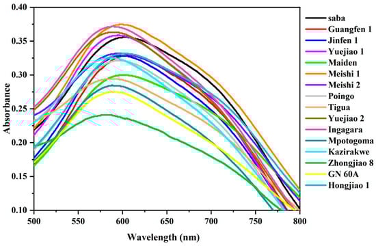 The absorption of the starch samples and iodine was attributed to the content of amylose and amylopectin. The combination of amylose and iodine produced a spiral complex which has a maximum absorption peak in the wavelength of 620–680 nm, while amylopectin formed a complex with iodine, which has a maximum absorption peak of 520–560 nm []. In our study, the iodine absorption spectra of the 16 BRS samples from the ABB, AAB, and AAA genome groups were obtained and are shown in Figure 6. The maximum absorption wavelengths of the BRS samples varied from 582 nm to 606 nm, which was between the maximum absorption peaks of amylose and amylopectin. The results indicated that all samples comprised both amylose and amylopectin. The value of the optical density (OD) at 620 nm (OD620) is usually used to assess the amylose content of starch []. It was anticipated that Meishi 1 (AAB) would exhibit a high amylose content, as indicated by the highest OD620 value. Conversely, Zhongjiao 8 (AAA) was expected to have the lowest amylose content, as indicated by the lowest OD620 value. Moreover, the ratio of amylose to amylopectin, as well as the weight of amylose molecules, impacts the aggregation of amylose molecules, resulting in different absorption peaks [,]. Guangfen 1 (ABB) had the largest absorption wavelength (606 nm), followed by Saba (ABB), Maiden (AAB), Hongjiao 1 (AAA), Meishi 1 (AAB), Meishi 2 (AAB), and Poingo (AAB), among which Zhongjiao 8 (AAA) reached the lowest value (582 nm). The results indicated that the BRS samples from the ABB and AAB genome groups exhibited a greater inclination to form resistant starch than those from the AAA genome group.