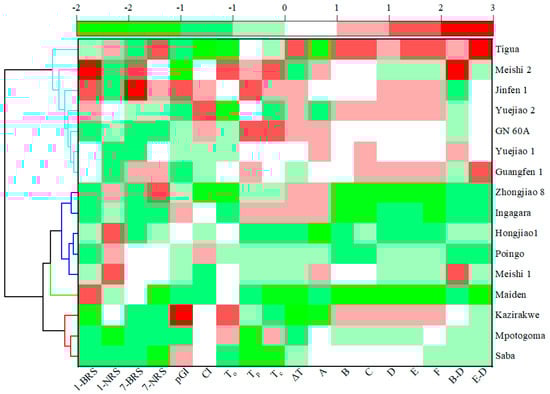 Heat map with dendrogram of BRS from 16 banana cultivars. The lines of the same color in the figure represent that these banana cultivars are classified into the same cluster. 1-BRS, resistant starch content of D1 banana flour; 1-NRS, non-resistant starch content of D1 banana flour; 7-BRS, resistant starch content of D7 banana flour; 7-NRS, non-resistant starch content of D7 banana flour; pGI, predicted glycemic index of banana flour; CI, crystallinity of resistant banana starch; To, onset temperature; Tp, peak temperature; Tc, conclusion temperature; ΔT, the gelatinization temperature range; A, initial gelatinization temperature; B, peak viscosity (BU); C, viscosity at 95 °C (BU); D, viscosity after 5 min at 95 °C (BU); E, viscosity at 50 °C (BU); F, viscosity after 5 min at 50 °C (BU); B-D: breakdown viscosity; E-D: retrogradation viscosity.