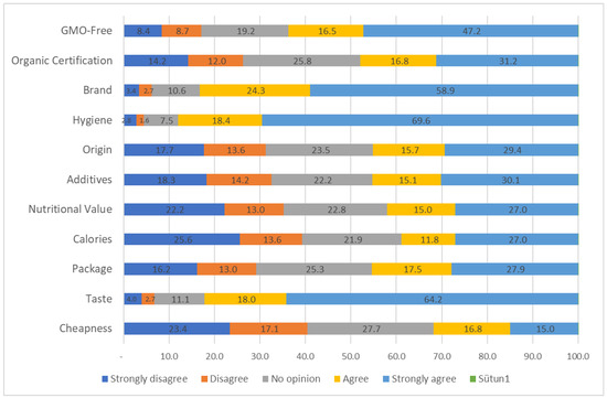 Figure 3 shows the percentage distribution of consumer preferences based on various product attributes, including price, taste, packaging, calories, nutritional value, additives, origin, hygiene, brand, organic certification, and GMO-free labeling. The results indicate that certain factors, such as taste, hygiene, and brand, play a dominant role in influencing consumer choices. For instance, 64.2% of consumers “strongly agree” that taste is a crucial factor in their purchasing decisions, highlighting its significant impact on product preference. Similarly, hygiene appears to be a decisive attribute, with 69.6% of consumers “strongly agreeing” that it is important, followed by 58.9% who consider brand as a key factor. In contrast, attributes such as cheapness and calories show a more divided response, with a notable portion of consumers expressing “no opinion” (27.7% for cheapness, 21.9% for calories), suggesting that these factors may not be universally important across all segments. Additionally, the table reveals that factors like organic certification and GMO-free labeling are gaining traction, with 31.2% and 47.2% of consumers, respectively, “strongly agreeing” on their importance. This may reflect growing consumer awareness of health and sustainability issues. On the other hand, the attributes related to packaging and additives display more mixed reactions, implying that they are of moderate importance to consumers.
