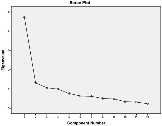 A sample size adequate for factor analysis is typically recommended to be four to five times the number of variables being studied. In this research, 667 participants responded to 12 different statements, demonstrating that the sample size is appropriate. To further assess the sample’s suitability, the Kaiser–Meyer–Olkin (KMO) test was applied. A KMO value between 0.5 and 1 is considered acceptable for such analyses. This study obtained a KMO value of 0.879, confirming that the sample size is sufficient for analysis, as indicated in Table 4 [25].