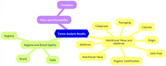Factor 1, accounting for 39.320% of the total variance, emerged as the most effective factor. Initially, analysis without rotation revealed multiple variables loading on various factors. To clarify and facilitate this, a varimax rotation was applied, which reduces the prevalence of variables loading high on a single factor and increases the clarity of factor interpretations [25,26]. It is recommended to preserve factor loadings with absolute values exceeding 0.45 [25,27,28]. Table 6 shows the factor loadings after varimax rotation. Variables such as packaging, calories, nutritional value, additives, origin, organic certification, and GMO were grouped under Factor 1; Factor 2 included taste, hygiene, and brand; Factor 3 is primarily associated with price (Figure 5).