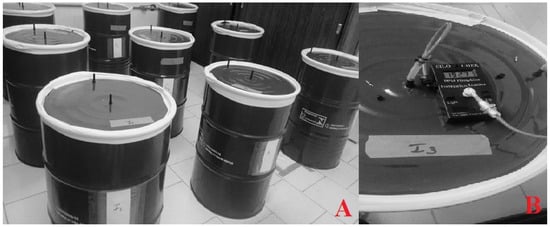 The samples were placed in metal drums at 28 °C and 55% relative humidity (Climate-controlled rooms with temperature and relative humidity control—Appropriate conditions for fumigation), hermetically sealed, with a capacity of 200 L and 3.0 g·m−3 of phosphine for 240 h (recommended time in the industry) (Figure 1A). The fumigation of each treatment was performed in triplicate (biological replicates).