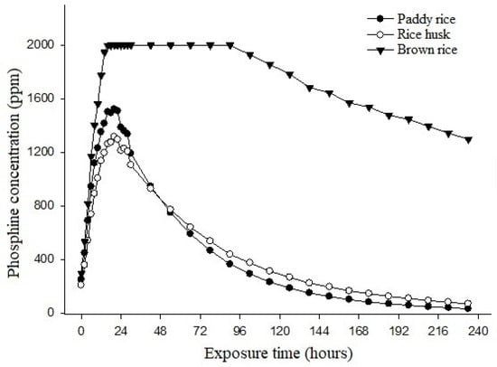 The results of the phosphine concentration in paddy rice, brown rice, and rice husk are presented in Figure 2. During the initial 20 h, an increase in phosphine concentration was observed. The maximum concentrations reached were 1520 ppm (20 h) for rice with husk, 2000 ppm (18 h) for brown rice, and 1314 ppm (20 h) for rice husk. The initial rise in the phosphine concentration is attributed to the reaction of the phosphate with the humidity that was present in the environment, releasing the phosphine gas []. The high concentrations persisted for a certain period, depending on the fumigated product, fumigation temperature and humidity, and the hermeticity of the fumigated environment [].