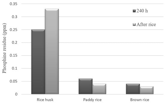 The results of phosphine residue in the paddy rice, brown rice, and rice husks are depicted in Figure 3. Initially, phosphine residues were analyzed in samples without fumigation, where no phosphine levels were detected. After 240 h of fumigation, phosphine levels of 0.25 ppm were observed in the rice husk, 0.06 ppm in the paddy rice, and 0.04 ppm in the brown rice. Following the fumigation period (240 h), the grains were aerated, and a residue analysis was conducted again after 4 days. The analysis revealed values of 0.33 ppm for rice husks, 0.04 ppm for paddy rice, and 0.03 ppm for brown rice.