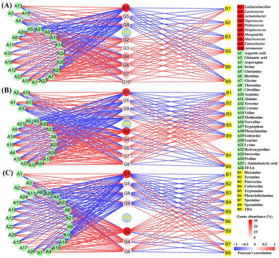 3.4. Correlation of Core Microbial Genus with BAs and FAAs in Group Dimension