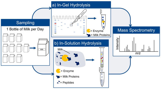 A more strategic and well-established approach in proteomics is to analyze peptides after an artificial degradation with an enzyme that leads to a significant number of peptides. The approach of analyzing (all) peptides released by artificial but reproducible degradation/digestion processes enables us to analyze the changes in the proteome rather than only individual peptides and ensures adaptivity to future studies. There are two ways to follow this so-called bottom-up strategy. The first one is “in-gel hydrolysis”, where the individual proteins are separated prior to enzymatic hydrolysis [28]. The advantage of this method is particularly noticeable in the interpretation of the data, as proteins can be separated and assigned to a certain position in the gel. Afterwards the potential marker peptide can then be related to the original protein. The main issue, however, is the multiple small sample preparation steps that are time-consuming and vulnerable to contamination. The second approach is known as “in solution hydrolysis”, in which the (food) sample of interest (in this case, milk) is directly hydrolyzed enzymatically without the proteins being separated previously [29,30]. This is an approach that is by far more time-efficient but more complex for identifying and assigning proteins or marker peptides, as the number of signals is significantly higher because it involves the whole proteome.